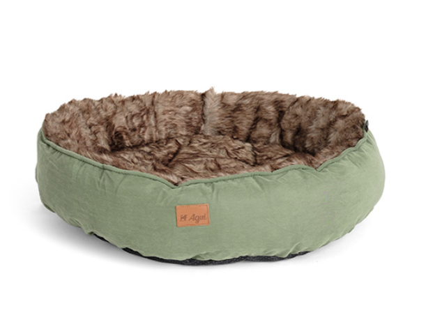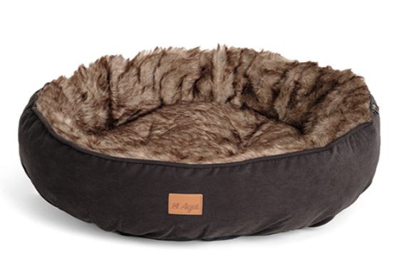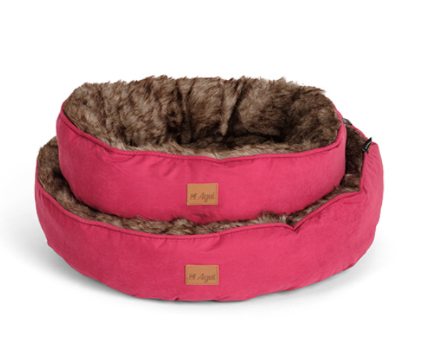 Cama em forma de donut, produzida em suavetecido com logótipo em pele. Interior revestido com pêlo suave e longo. Enchimento interior em fibra 100% reciclada.