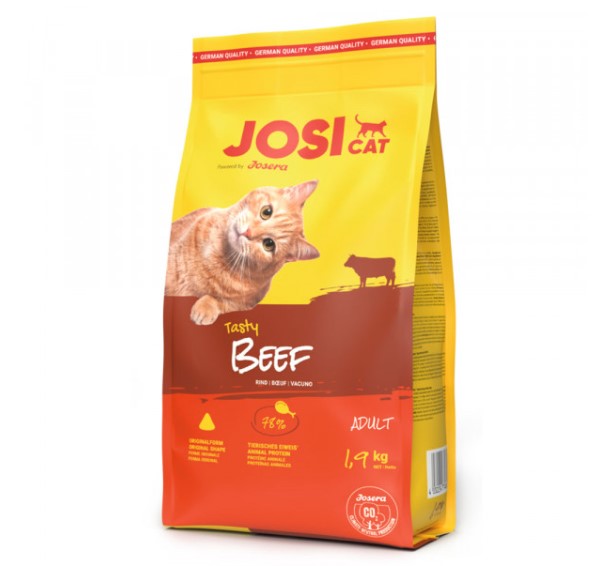 JosiCat Tasty Beef é um alimento saboroso de carne bovina completo para gatos adultos, com baixo teor de gordura, que proporciona um peso corporal saudável. Esta ração não tem adição de corantes, aromatizantes ou conservantes artificiais.