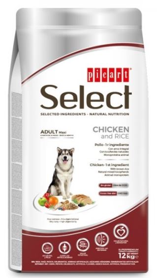 Picart Select Maxi Adult Chicken and Rice é um alimento seco completo, que responde às necessidades nutricionais dos cães de porte grande, ou seja, aqueles que pesam mais de 25 kg quando adultos, atingindo a idade adulta aos 24 meses. Uma dieta que responde às necessidades destes cães, contribuindo para uma boa saúde e bem-estar geral.