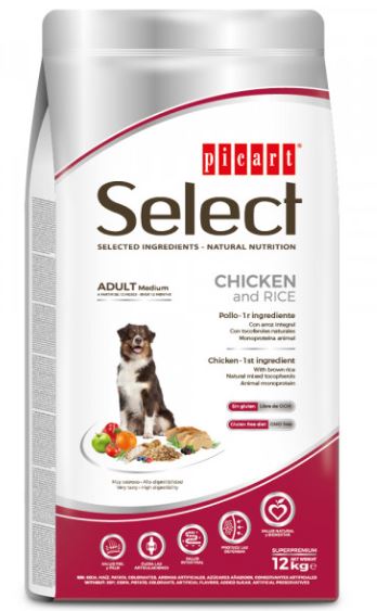 Picart Select Medium Adult Chicken and Rice é um alimento completo que responde às necessidades dos cães adultos de raças médias, ou seja, aqueles que pesam entre 11 kg e 25 kg, a partir dos 12 meses de idade. Uma dieta equilibrada, que favorece o bem-estar geral e boa saúde do animal.